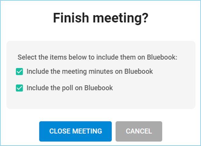 After publishing the minutes and concluding the meeting, click on "Close Meeting”, then select the option "Include the meeting minutes on Bluebook" as illustrated in the image below: