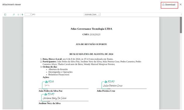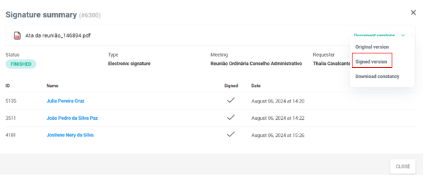 - After the minutes are published and the signatures are requested, access the “Signature Summary” option located on the right side of the screen;