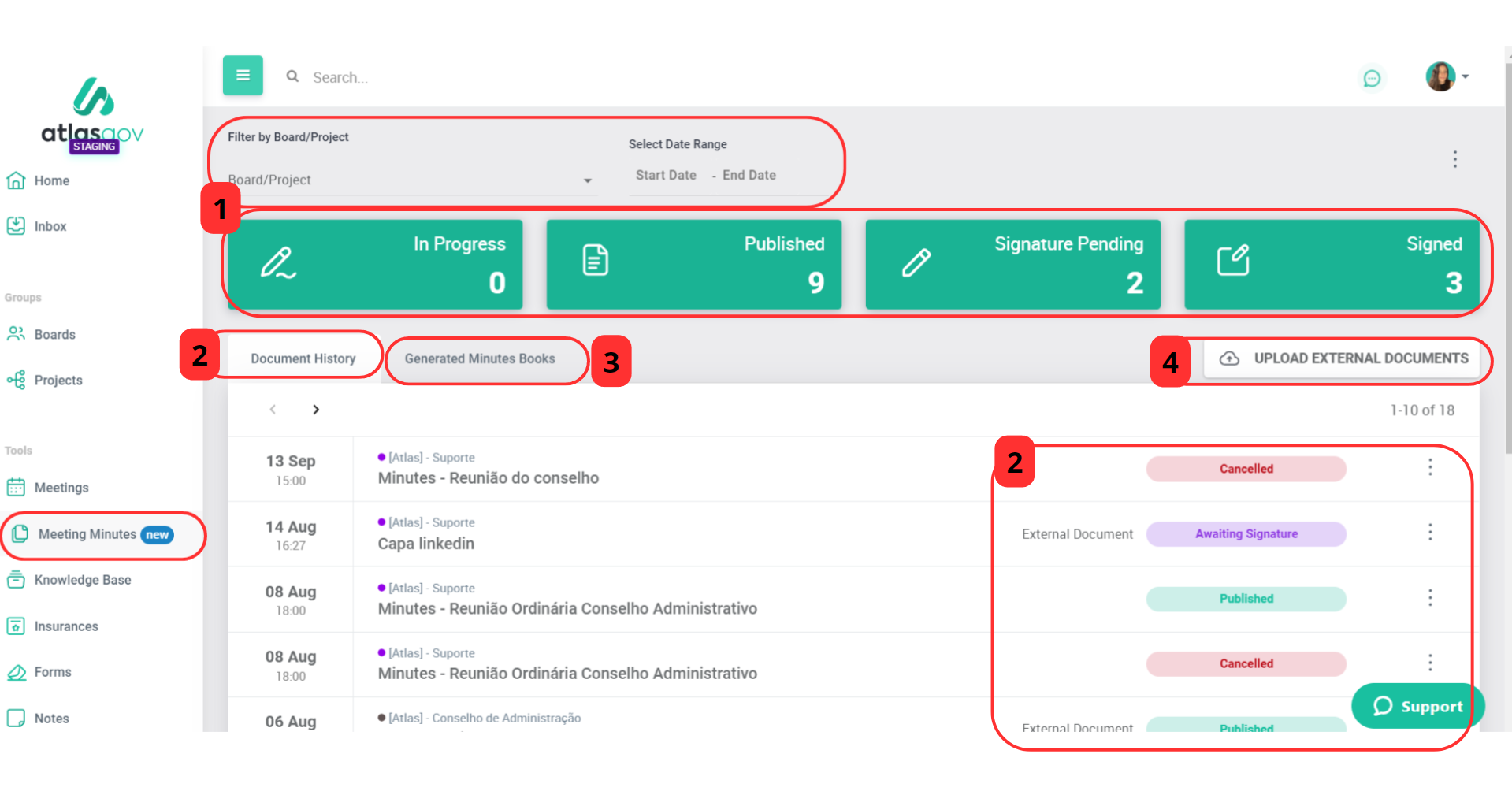 Exclusive to the Enterprise plan, the "Meeting Minutes" feature centralizes all published minutes within the company's environment on the Portal, including document history and filters by "Boards/Projects" and "Period."