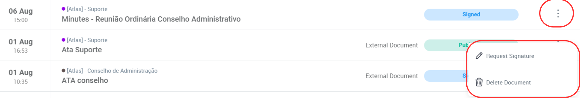 In the "Document History" tab, you can perform various actions related to the minutes and documents. Below, I explain each of the options available when clicking the three dots next to a document: