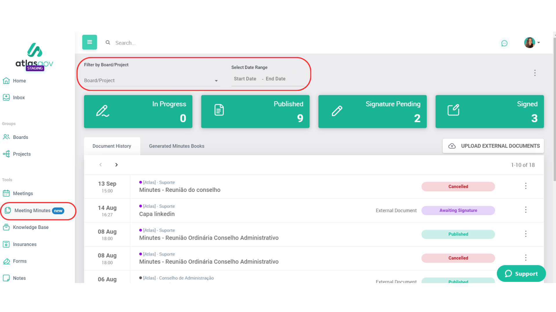 The "External Document Upload" function allows you to import external documents into Atlas to be included in the "Minutes Book."