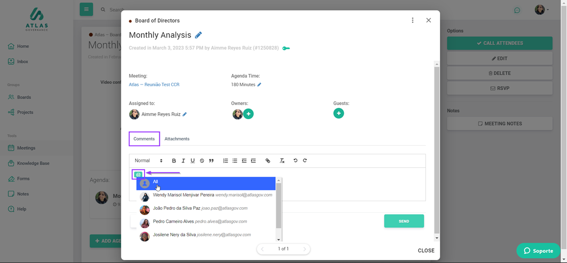 - On "meetings", click on the agenda item where you are going to mention a user. You must go to the section of comments and type "@"and you will have the option to mention all the attendees of the Board with the button "All" or individually, you just need to type the name of the user. When you finish, click on "Send".