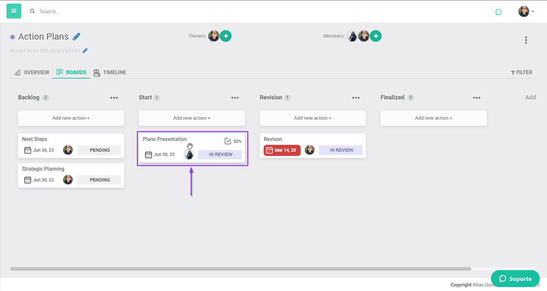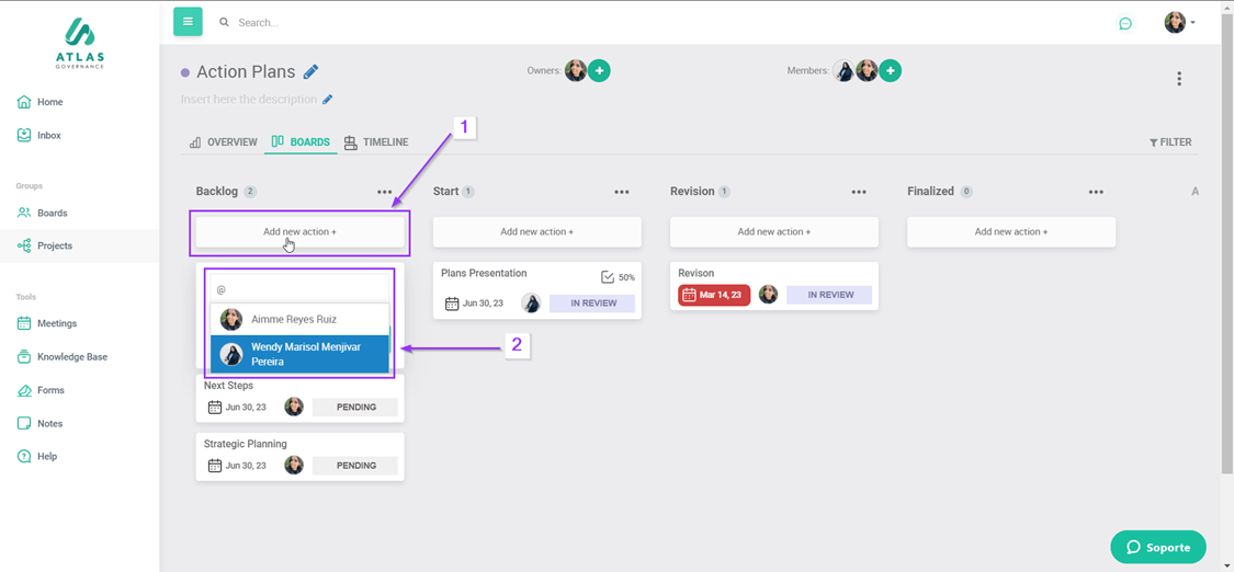 - In "Projects", you can mention people when assigning actions to the project’s members. You just need to click on the option "Add new action" and after that, select the member that will be responsible for the action and do the mention.