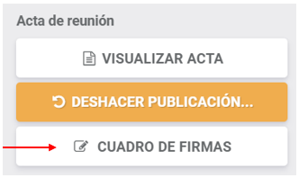- Tras la publicación del acta y la solicitud de firmas, acceda a la opción "Cuadro de Firmas", ubicada en el lado derecho de la pantalla;