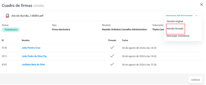 - A continuación, seleccione la opción "Versión Firmada" en la esquina superior derecha;