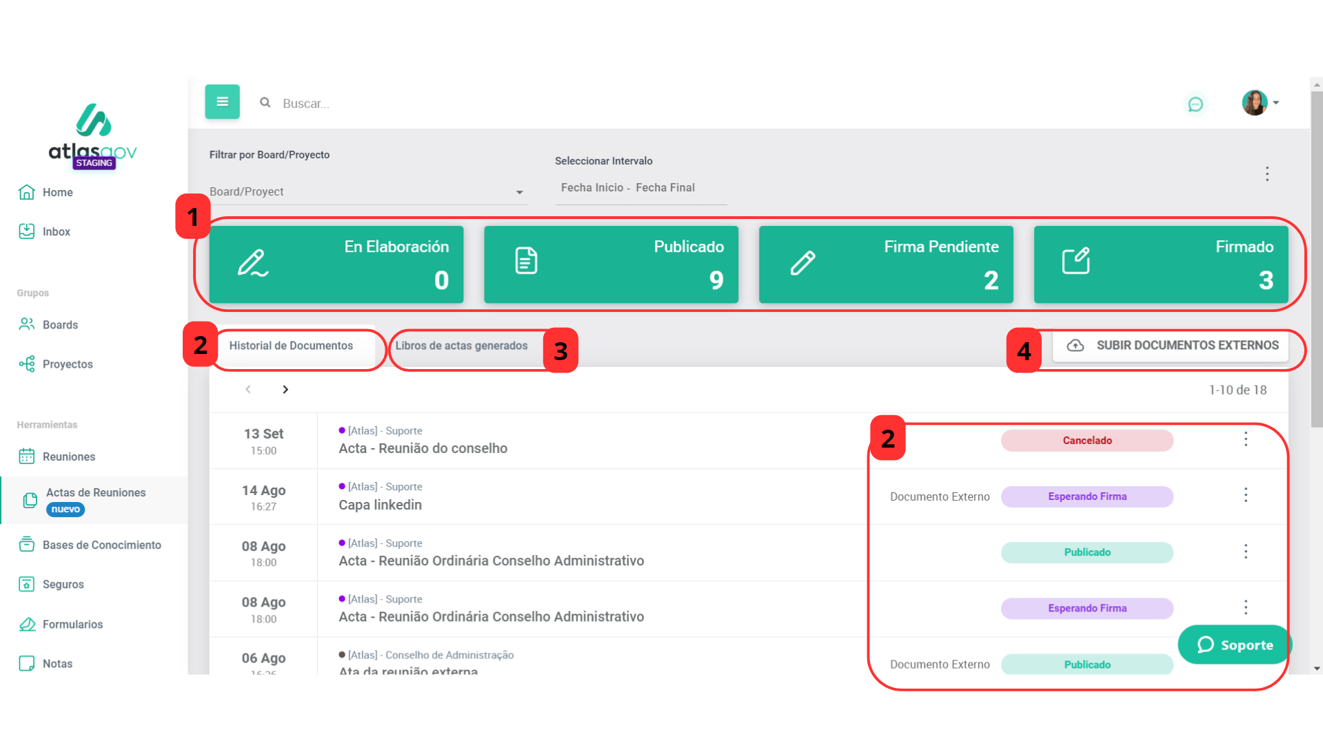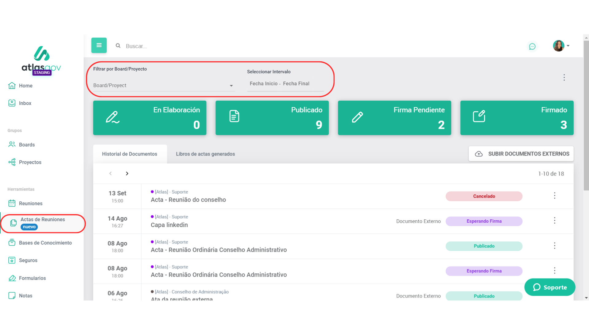 Exclusiva del plan Enterprise, la funcionalidad "Actas de Reuniones" centraliza todas las actas publicadas en el entorno de la empresa en el Portal, incluyendo el historial de documentos y filtros por "Consejos/Proyectos" y "Período".