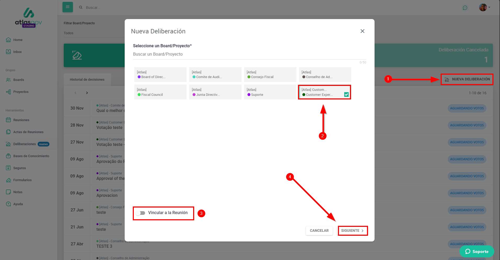 Seleccione el Board / Proyecto en el que se lleva a cabo esta deliberación y elija uno de estos dos caminos: