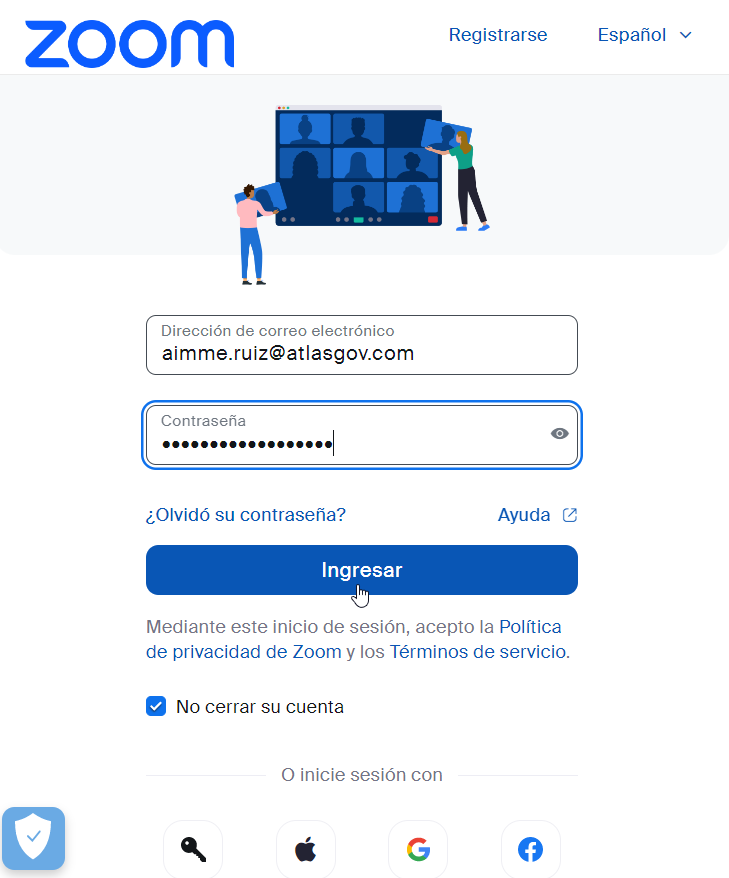 - Active la opción de "Zoom", al dar clic se abrirá una pestaña para que ingrese sus credenciales de Zoom y autorice la aplicación Atlas Governance para acceder a su cuenta y crear reuniones en su nombre.