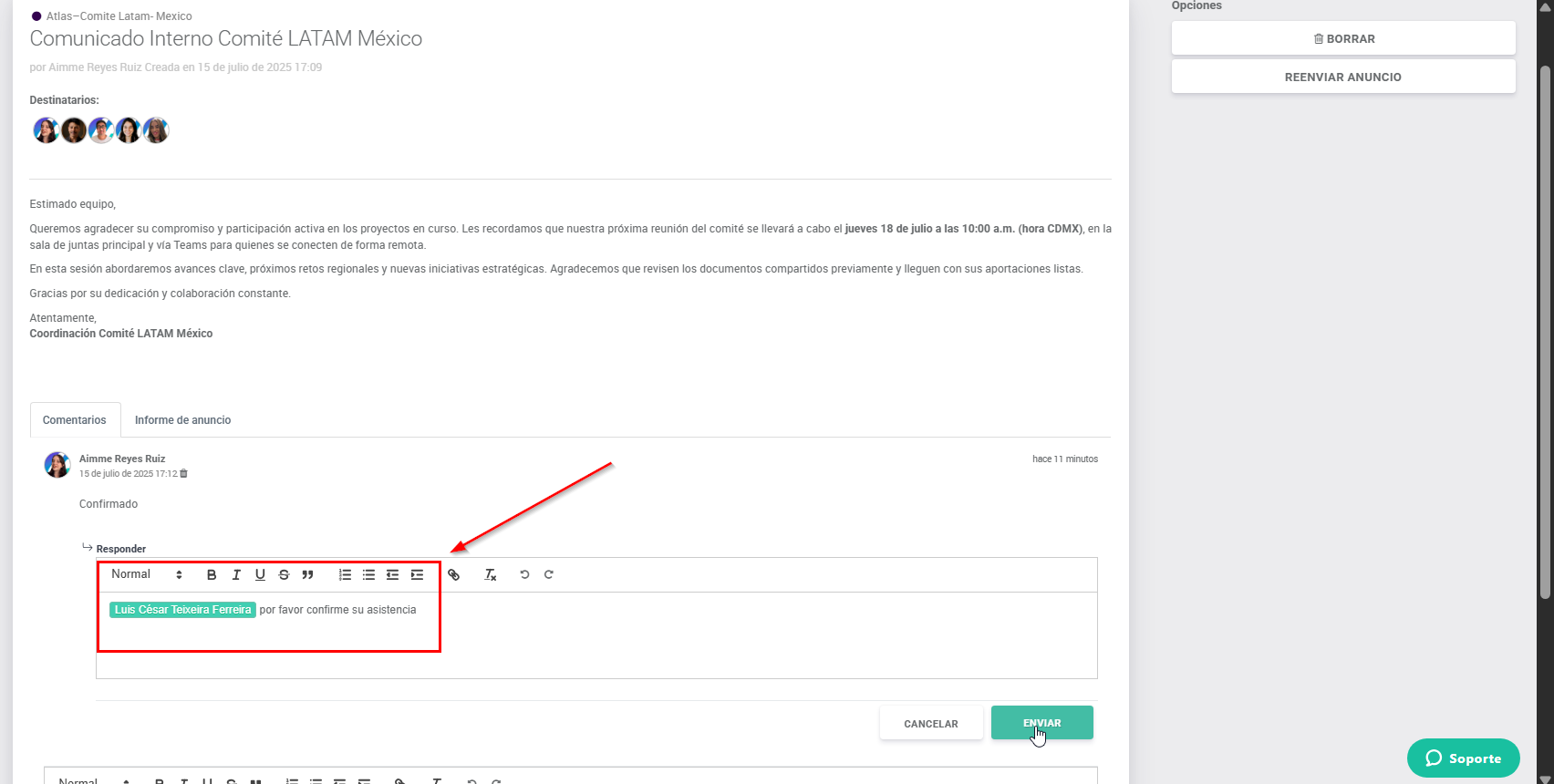 Ahora puedes comentar y responder comentarios en los comunicados recibidos por Atlas directamente desde el navegador.