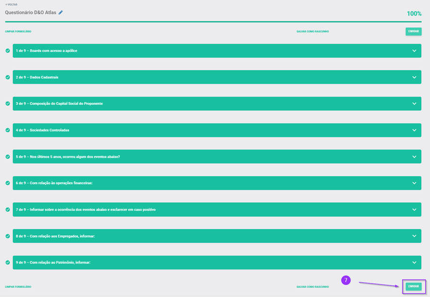 7.Preencha as 9 questões. Quando todas estiverem preenchidas corretamente, a barra superior atingirá 100%, e as cores das perguntas mudarão para verde. (Você também pode salvar o questionário como rascunho, limpá-lo ou editar o título, se desejar);