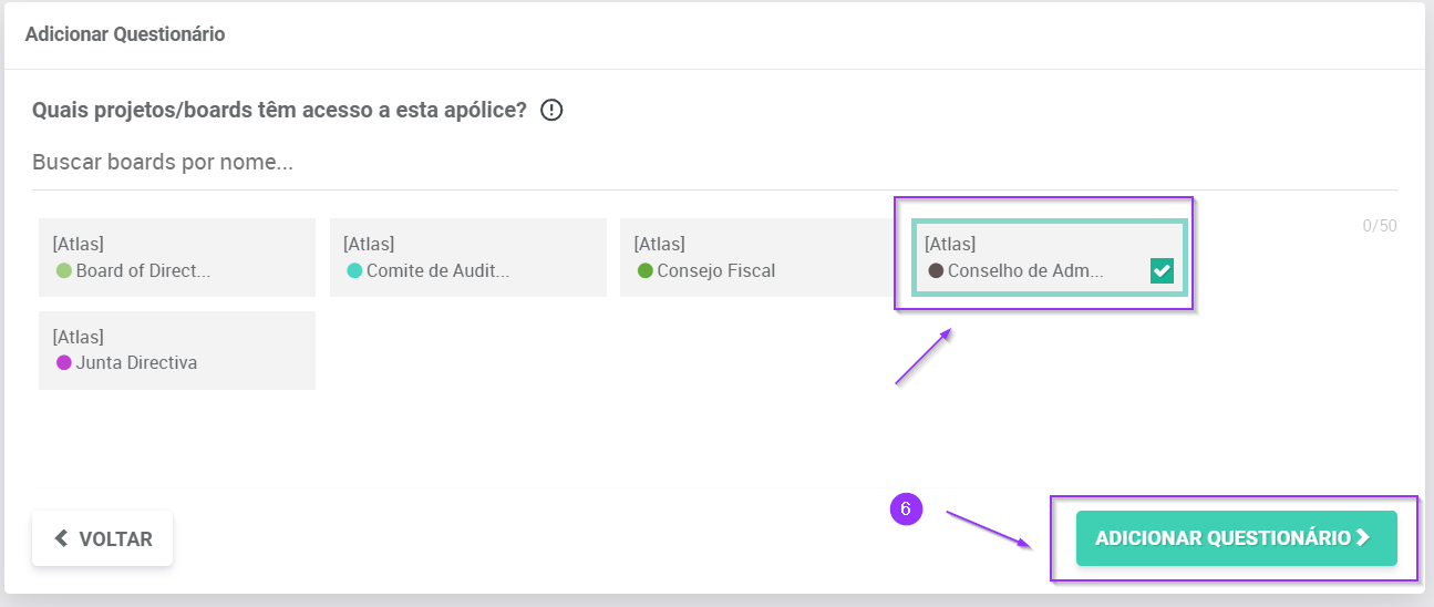 6.Selecione os boards vinculados ao questionário e clique em “Adicionar questionário”;