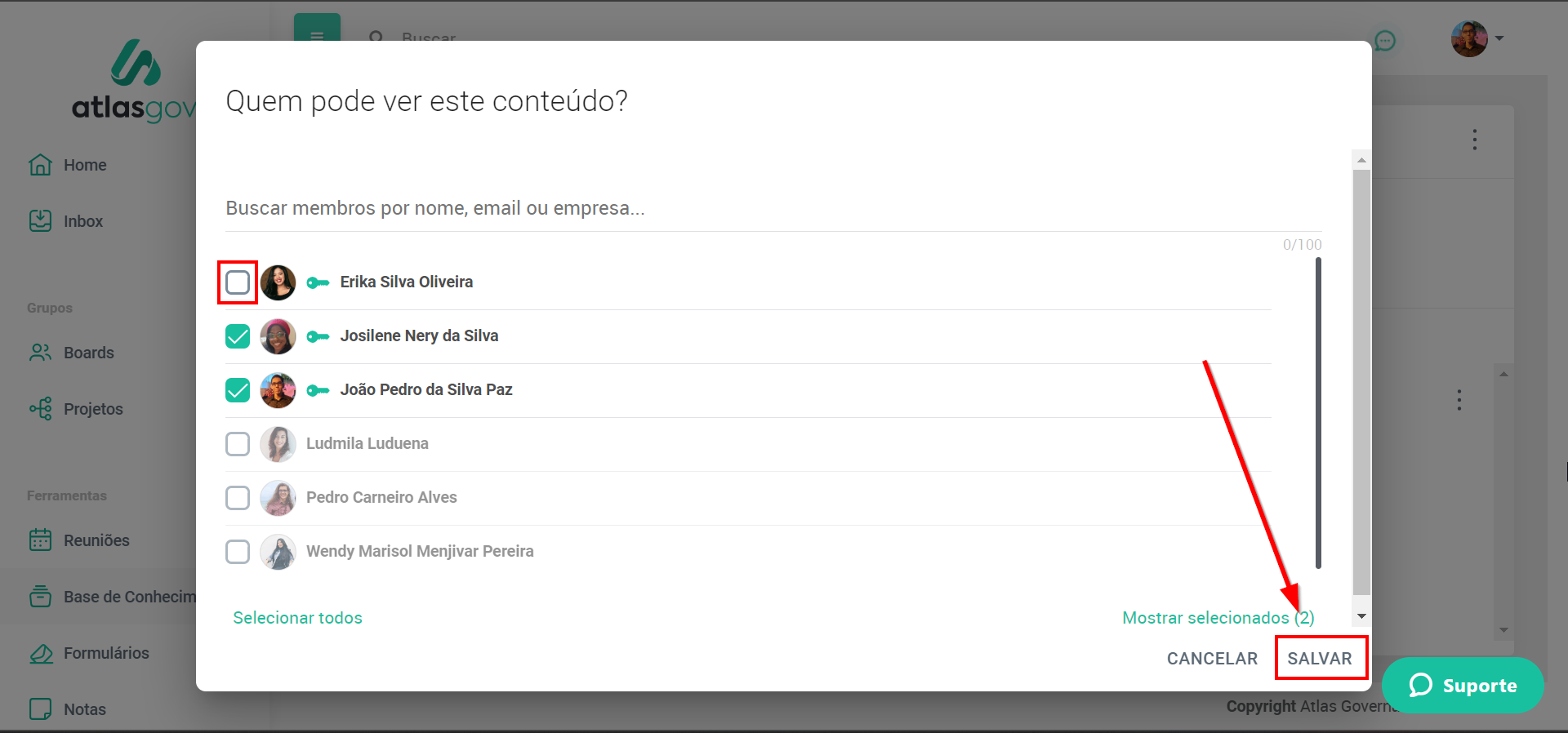 - Clique em “Salvar” e para esse(s) usuário(s) será como se a pasta não existisse. Ele não terá acesso a nenhum conteúdo vinculado a ela.