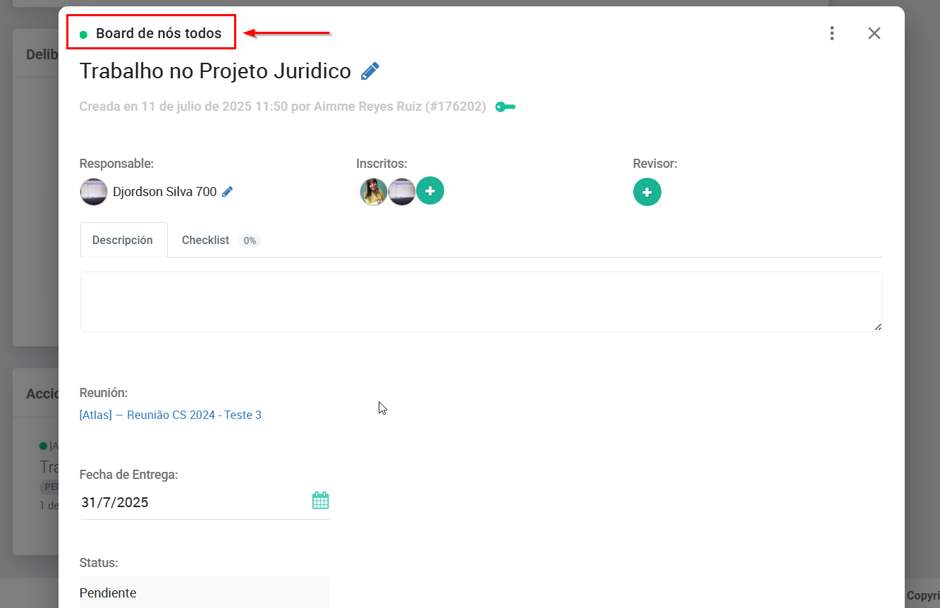 Exemplo de visualização da ação com nome do Board externo no topo. A ação continuará visível dentro da reunião original, com uma tag de "Board/Projeto externo".