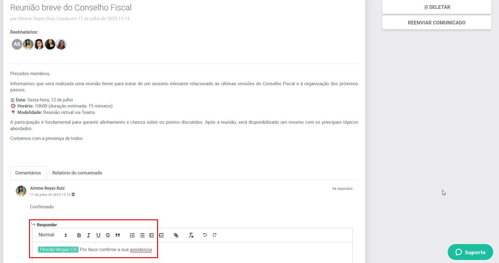Funciona em comunicados automáticos (convocação, ata) e manuais (criados diretamente).