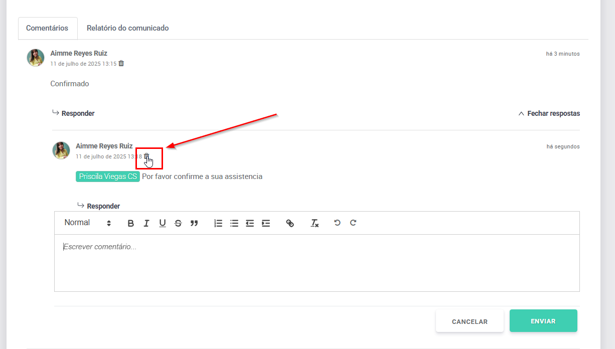 Se for o seu comentário, ou se você for o proprietário do comunicado, será exibido o ícone de lixeira ao lado da data/hora do comentário. Basta clicar para removê-lo.