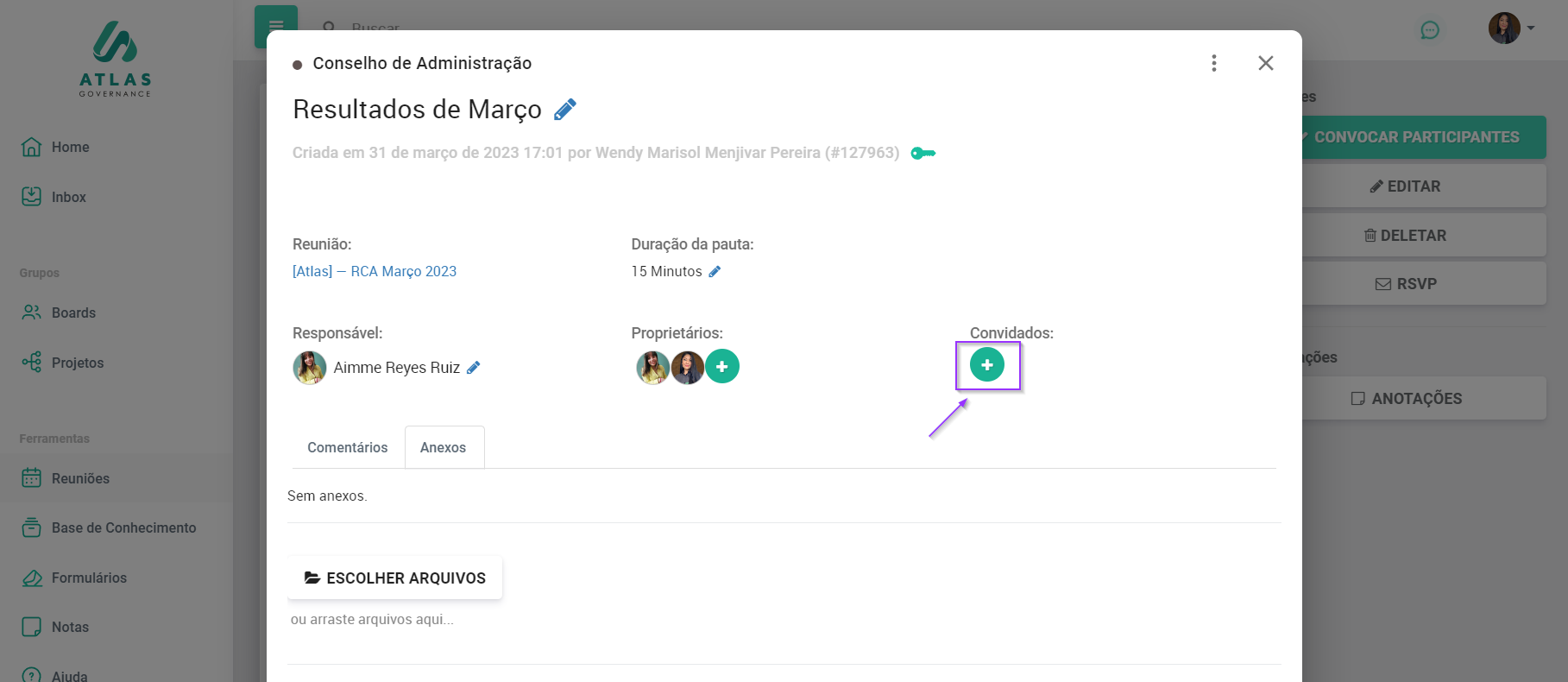 - Entre na pauta que deseja e selecione o + verde ao lado de “Convidados”;