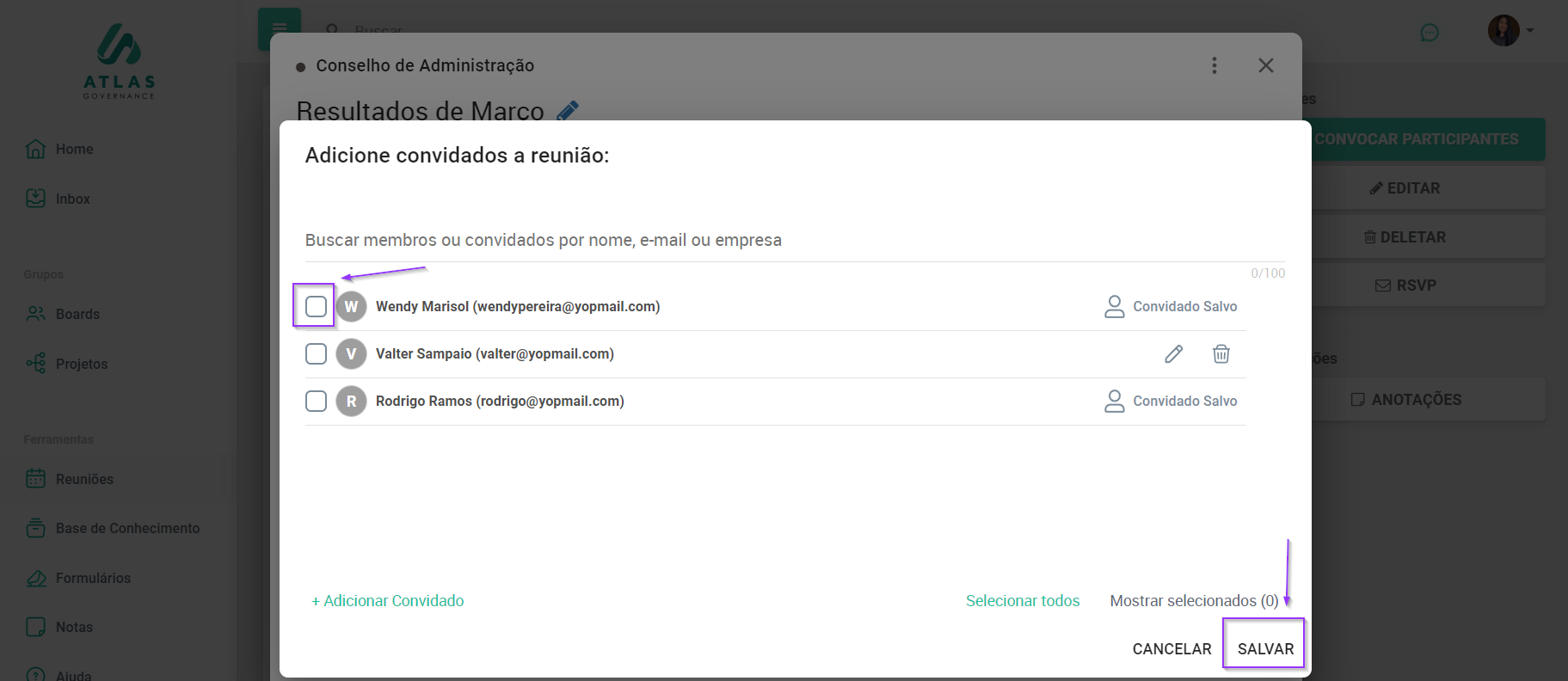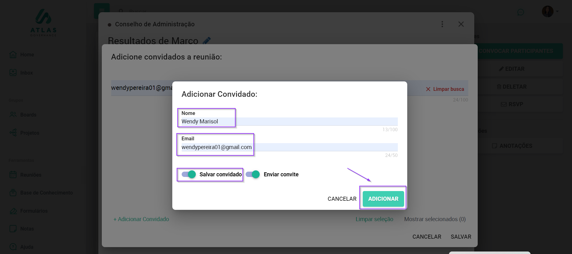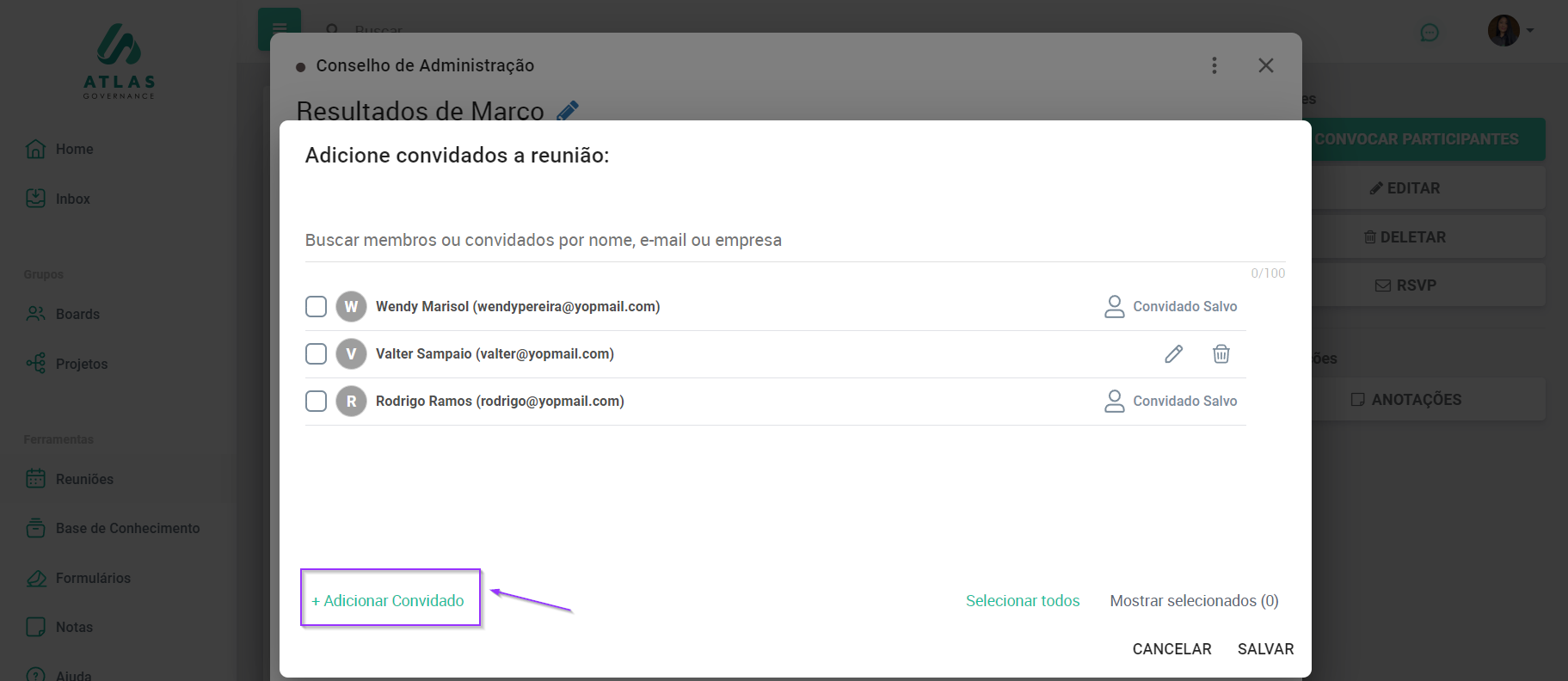 Caso seja um convidado que ainda não esteja salvo no portal, basta clicar em “Adicionar convidado”, incluir o nome e e-mail para que o convidado receba o invite.
