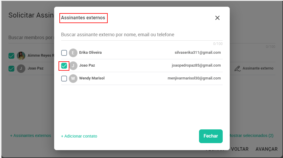 Observação: Agora temos lembrança de assinantes. Caso tenha solicitado a assinatura para um usuário externo uma vez, nas próximas solicitações, ele virá pré selecionado!